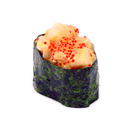 Гункан з тигровою креветкою, спайс соусом та ікрою тобіко..