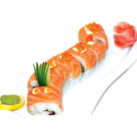 лосось, вершковий сир, огірок, ікра тобіко, вугор, политий соусом унагі та посипаний смаженим кунжутом..