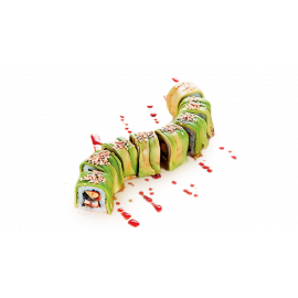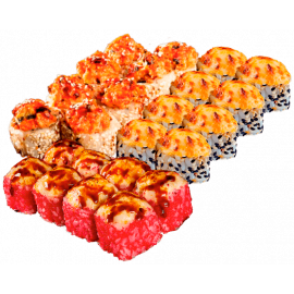 лосось, вершковий сир, огірок, ікра тобіко, вугор, политий соусом унагі та посипаний смаженим кунжутом
