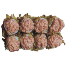 Гострий рол з лососем, слабосоленим лососем, вершковим сиром, огірком, японським майонезом, кімчі, та ікрою тобіко