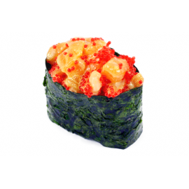 Гункан з тигровою креветкою, спайс соусом та ікрою тобіко..
