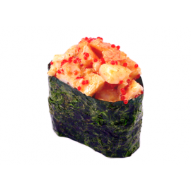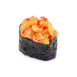 Гункан з лососем, спайс соусом та ікрою тобіко..