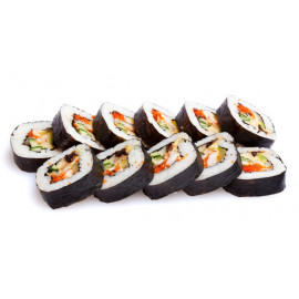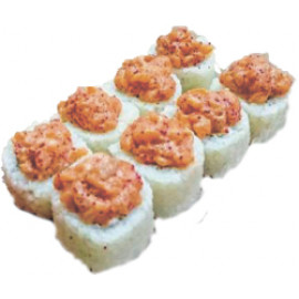 Гострий рол з тунцем, огірком, ікрою тобіко, спайсі соусом, лососем і посипаний стружкою тунця